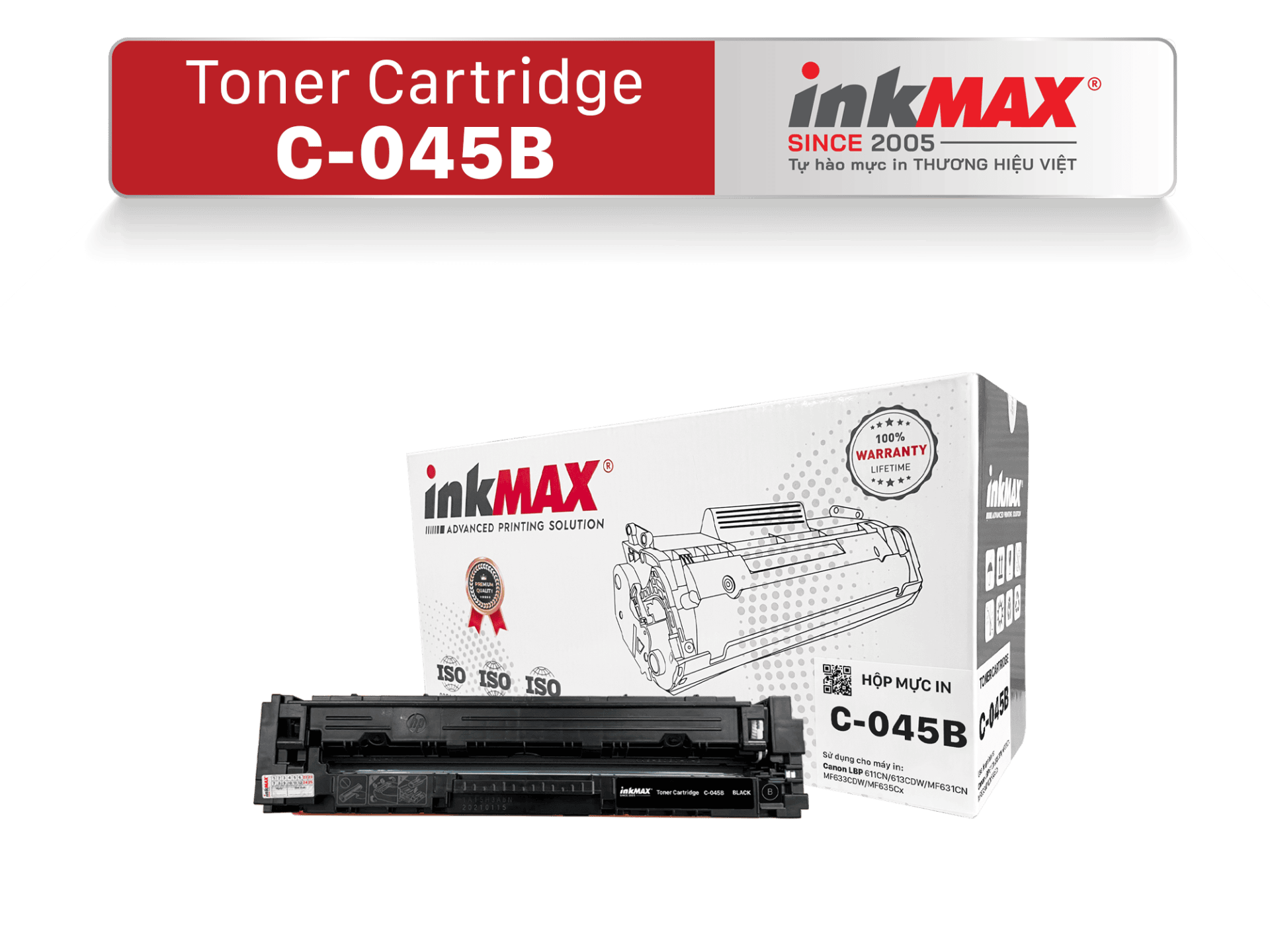 được sản xuất theo tiêu chuẩn kỹ thuật của chính hãng. Bản in ra có đẹp hay không phần lớn chủ yếu là do hộp mực vì vậy inkMAX sản xuất ra dòng sản phẩm hộp mực C-045B để đáp ứng nhu cầu của khách hàng với chất lượng cao, trang in sắc nét, độ bền mực cao. Mực in tương thích đạt đến mức độ hoàn hảo với máy in như mực chính hãng giúp máy in của bạn vận hành ổn định, không hư hại linh kiện,hạn chế việc kẹt giấy trong quá trình bạn sử dụng, giúp máy duy trì tuổi thọ cao.