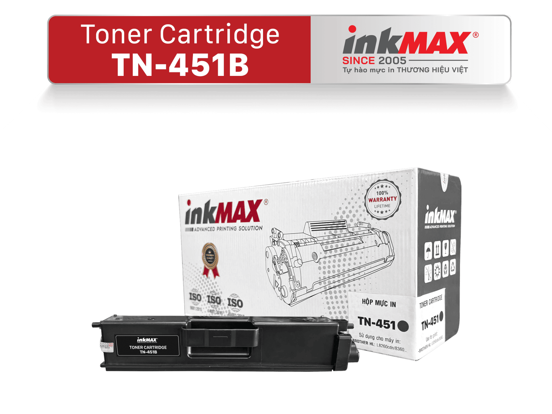 được sản xuất theo tiêu chuẩn kỹ thuật của chính hãng. Bản in ra có đẹp hay không phần lớn chủ yếu là do hộp mực vì vậy inkMAX sản xuất ra dòng sản phẩm hộp mực TN-451B để đáp ứng nhu cầu của khách hàng với chất lượng cao, trang in sắc nét, độ bền mực cao. Mực in tương thích đạt đến mức độ hoàn hảo với máy in như mực chính hãng giúp máy in của bạn vận hành ổn định, không hư hại linh kiện,hạn chế việc kẹt giấy trong quá trình bạn sử dụng, giúp máy duy trì tuổi thọ cao.