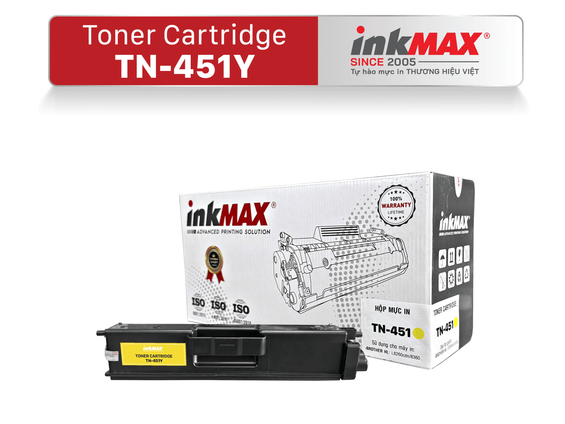 được sản xuất theo tiêu chuẩn kỹ thuật của chính hãng. Bản in ra có đẹp hay không phần lớn chủ yếu là do hộp mực vì vậy inkMAX sản xuất ra dòng sản phẩm hộp mực TN-451Y để đáp ứng nhu cầu của khách hàng với chất lượng cao, trang in sắc nét, độ bền mực cao. Mực in tương thích đạt đến mức độ hoàn hảo với máy in như mực chính hãng giúp máy in của bạn vận hành ổn định, không hư hại linh kiện,hạn chế việc kẹt giấy trong quá trình bạn sử dụng, giúp máy duy trì tuổi thọ cao.