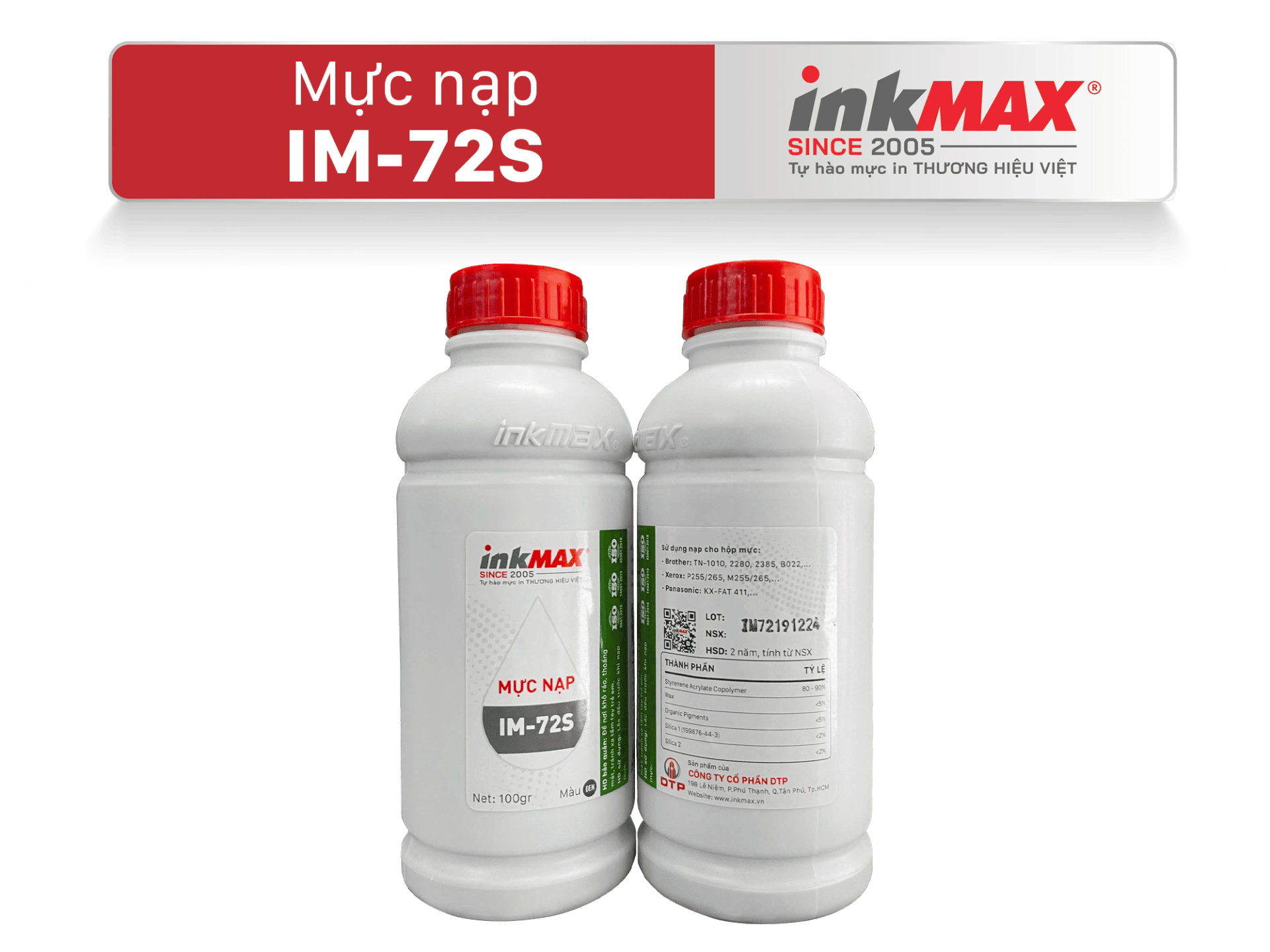 Sản phẩm được thiết kế tương thích hoàn hảo với hộp mực của các dòng máy in Brother, Panasonic. Sản phẩm đã được cấp các chứng nhận tiêu chất lượng ISO 9001:2015, ISO 14001:2015, ISO 45001:2018.
